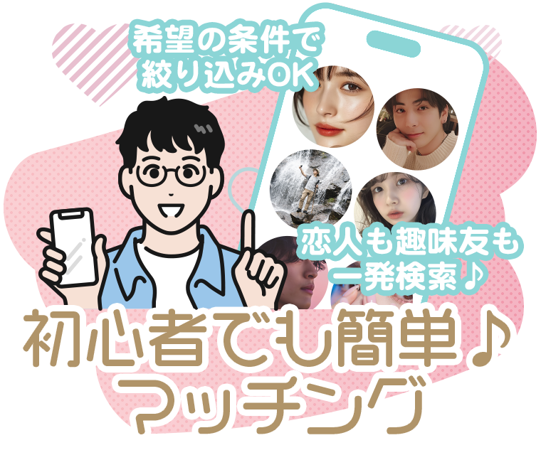 プロフを登録したら、早速お相手検索スタート!相手のプロフや写真を見て気になったら、積極的に話しかけましょう。希望の条件で絞り込み検索も可能です。